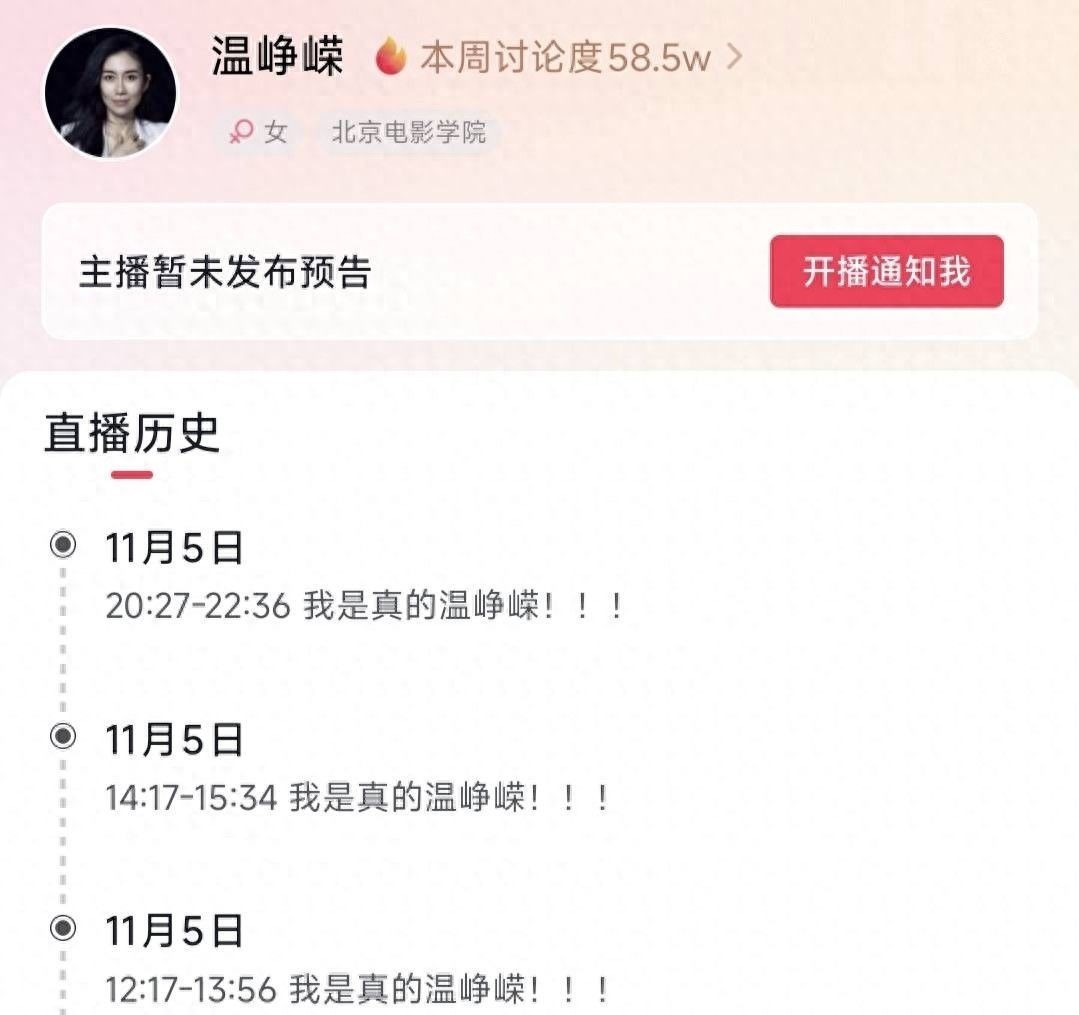 11月5日当天,温峥嵘连续开启三场主题为“我是真的温峥嵘”的直播,亲自澄清事实,甚至透露自己曾被AI直播间拉黑无法进入。